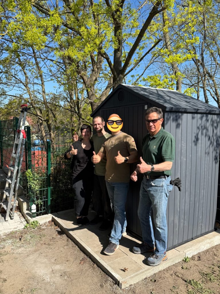 Mit ganz wunderbarer Unterstützung durch den Hausmeister der Schule Torsten Seelig sowie engagierte Eltern und einen Großvater fühlte sich der Aufbau des Gartenhauses inklusive Bodenfundament gar nicht mehr so schwer an. Was uns so große Sorgen bereitet hatte, lief wie am Schnürchen und nach nur wenigen Stunden Arbeitseinsatz stand das von Hornbach gesponserte Gartenhaus, das nun in Zukunft die Möbel für das grüne Klassenzimmer beherbergen wird, wenn sie nicht im Einsatz sind. Zudem wurde von Mitgliedern des Fördervereins noch ein Sichtschutz zum Nachbarn der Schule installiert.